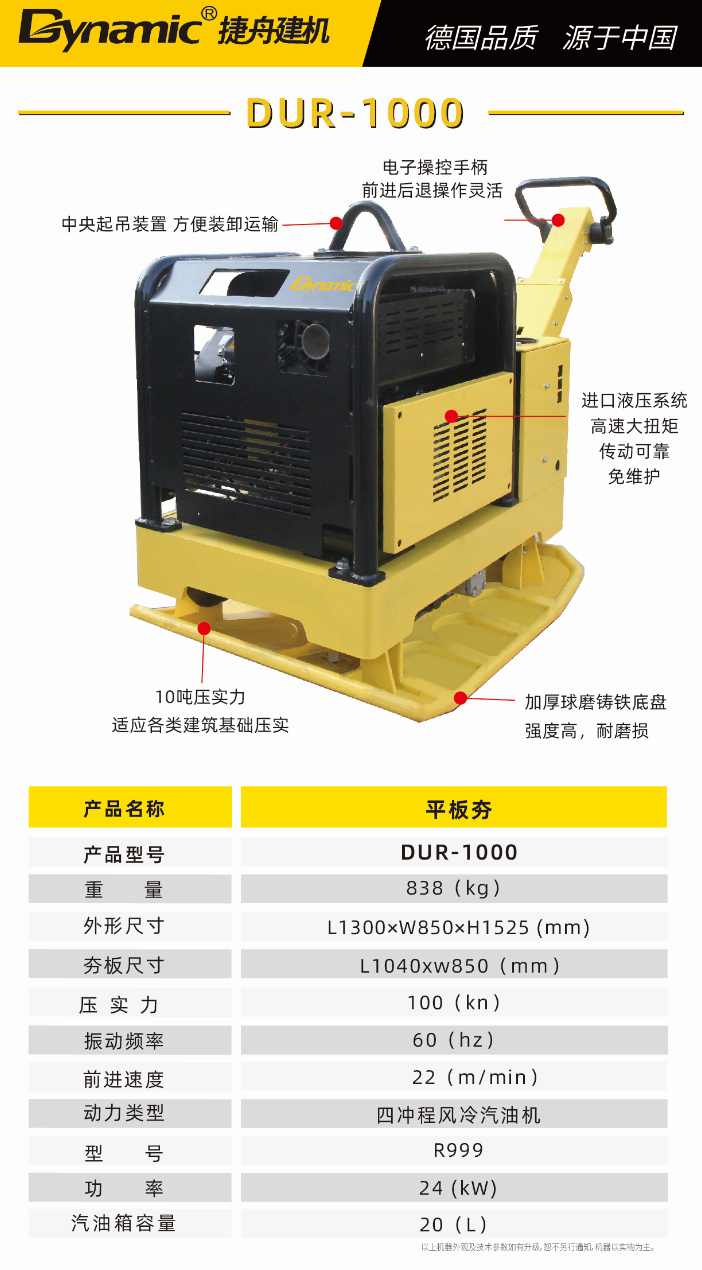 DUR-100平板夯,自重722kg,压实能力100kN(约10吨),凭借其卓越的设计和精湛的制造工艺,确保机器在运行过程中发挥完美性能。标配Rato R825发动机,功率20kW,动力强劲,维护简便。一键电子点火,启动快捷方便。此外,还可选配高品质柴油发动机。同时,也可选配符合EPA认证的发动机。