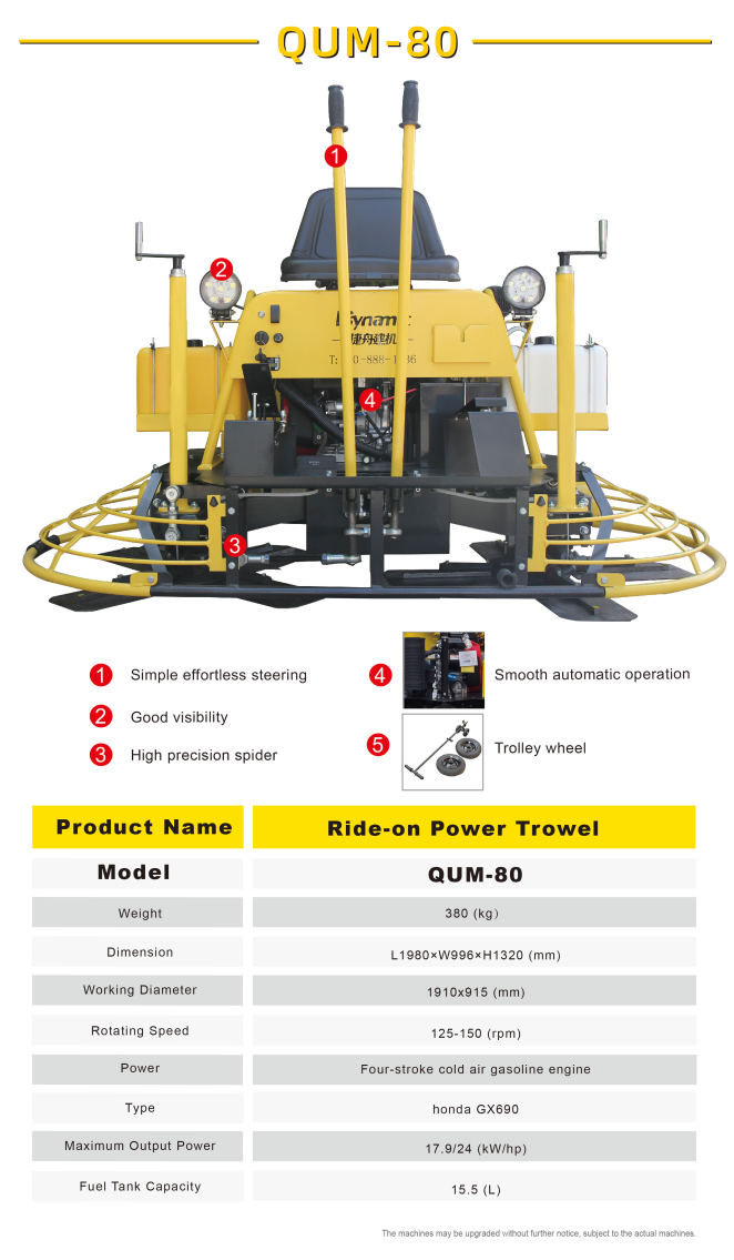 Introduction:Ride-on trowel machine series products are equipped engines like Honda, Bailiton etc., providing powerful performance.The transmission system is efficient and simple, stable and reliable; Heavy load large worm gear box, prevent oil leakage. Products enjoy the world, widely praised by professional users.